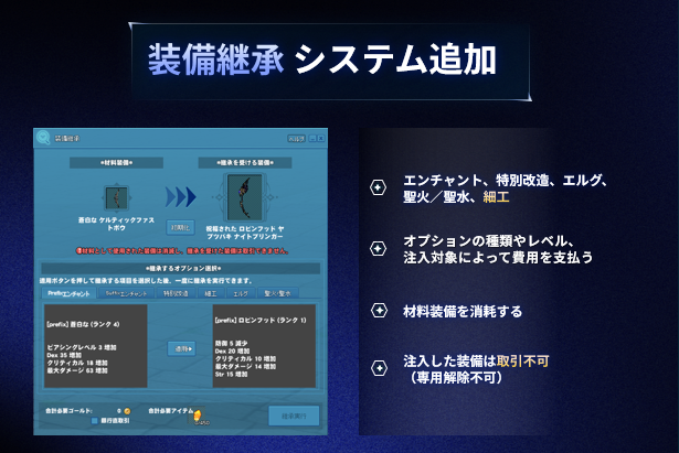 移転する際には、移転する強化要素の種類やレベルに応じて材料とゴールドが消費されます。継承システムが現在のアイテム製作やダンジョン報酬の価値に及ぼす影響を考慮し、材料装備は消費され、注入装備は永久取引不可になるようにしました。